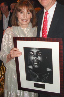 Heiress & designer, Gloria Vanderbilt, A recipient of The Gordon Parks Foundation Award, holds Gordon Parks photo of Muhammed Ali, auctioned at Gordon Parks Awards Dinner