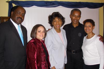| L to R: Bud L. Williams, Springfield City Council President; Elizabeth Cardona, Dir. of Gov. Deval Patrick’s W Mass. office; Juanita Torrence-Thompson, Point of View Columnist & Editor/Publisher of Möbius celebrate with Frederick & Marjorie Hurst, Publisher & Editor of Point of View.